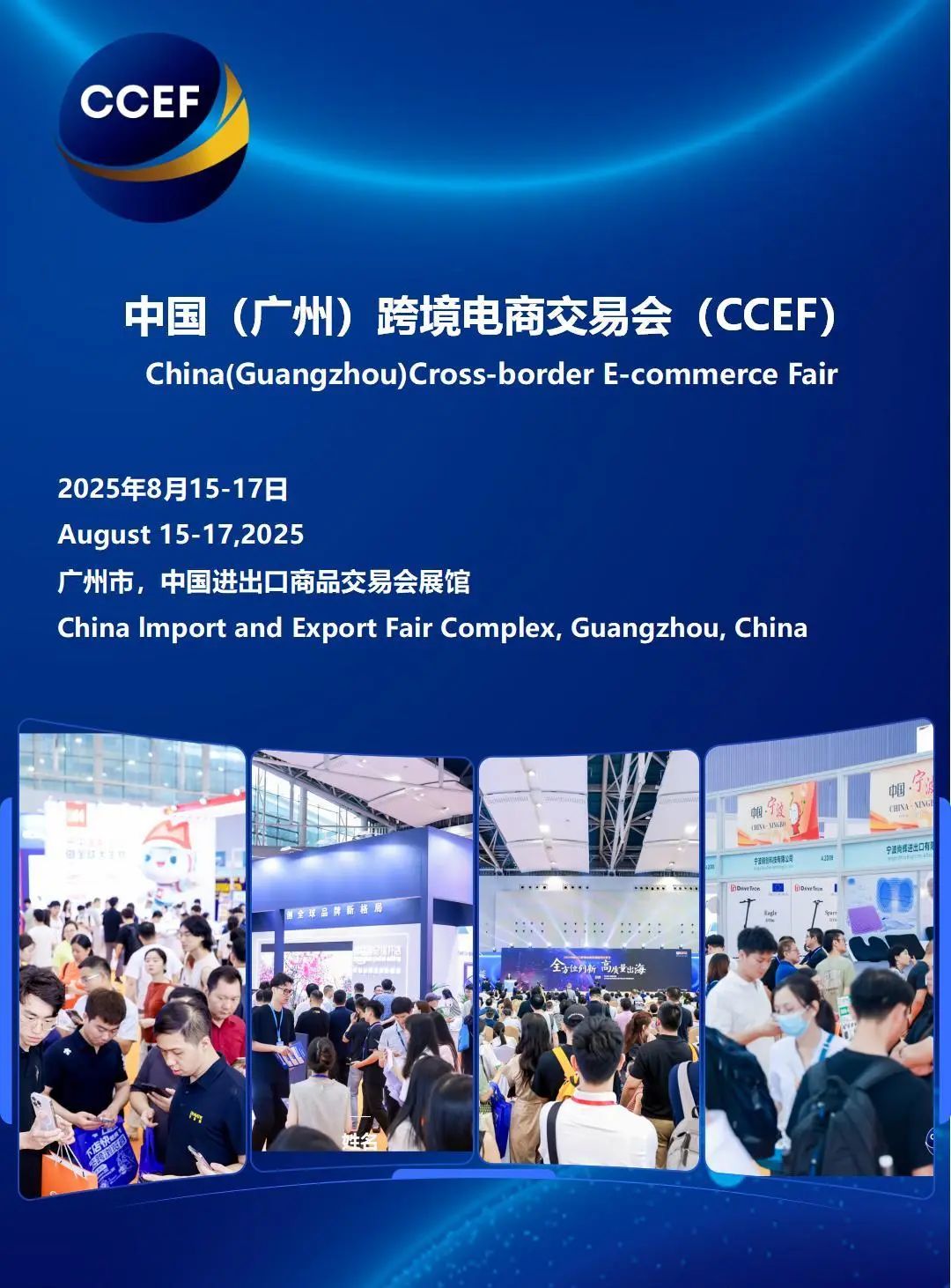 1、展会基本介绍: 中文名称:2025中国(广州)跨境电商交易会 (秋季) 简称:中国跨交会(秋季) 英文名称: China Cross-Border E-Commerce Fair(Autumn)(CCEF) 展会时间:2025年8月15-17日 地 点:中国,广州市,中国进出口商品交易会展馆(即广交会展馆) 主办单位:中国对外贸易中心集团有限公司、 承办单位:中国对外贸易广州展览有限公司