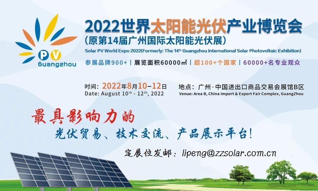 2022年 8月 10日-12日在广州·中国进出口商品交易会展馆B区隆重举办!Solar PV World Expo 2022预计展商900多家,展览面积60000平方米,超100个国家的60000多名专业观众。是国内外品牌拓展中国市场的重要通道,是布局全球网络的最佳渠道,是光伏行业年度新品发布重要平台及贸易导向。