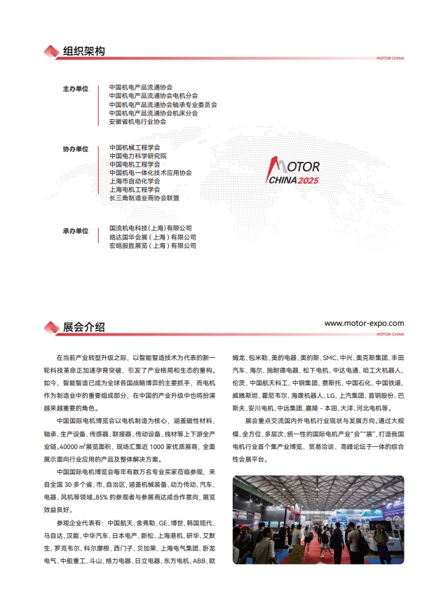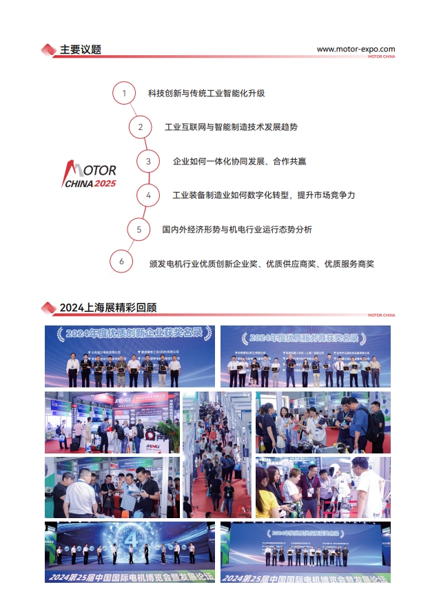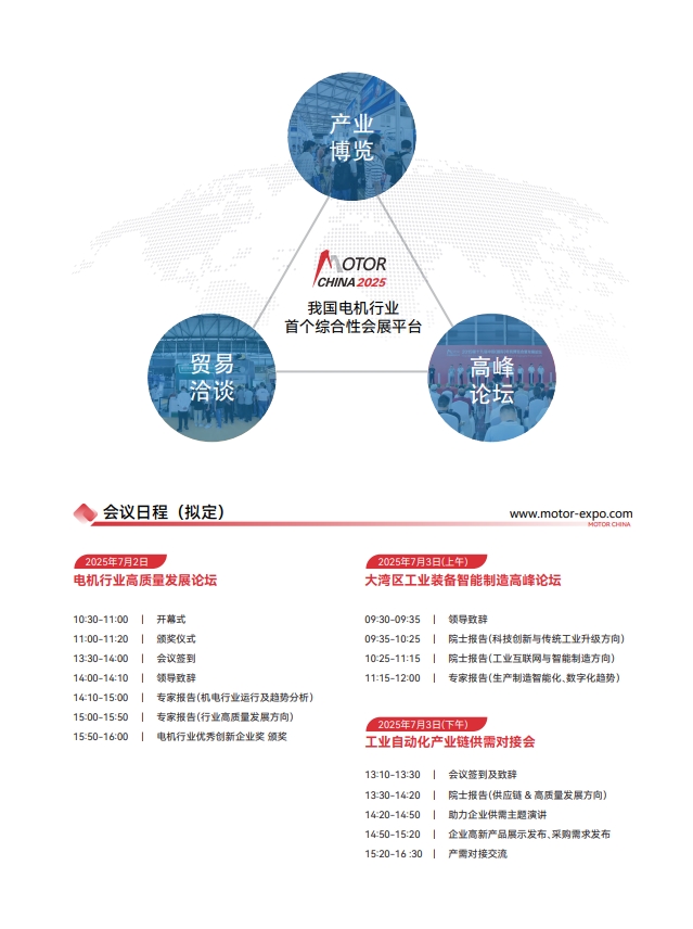 【中国电机展】2025第27届中国国际电机博览会暨发展论坛(简称:2025上海电机展览会)由上海国皓会展(集团)有限公司和国流机电科技(上海)有限公司承办。于2025年7月2-4日在上海新国际博览中心召开,本届特设新能源车用电机展区,专注于新能源车用电机电控领域的专业主题展,展会以独特的办展理念,以专注于品牌化运作,为客户开拓新能源车市场提供高效解决方案。希望通过上海电机展的举办能更好的电机行业市场的开拓和发展,推动电机企业、供应企业和配套产品公司的合作共赢。参展联系189-5209-2405